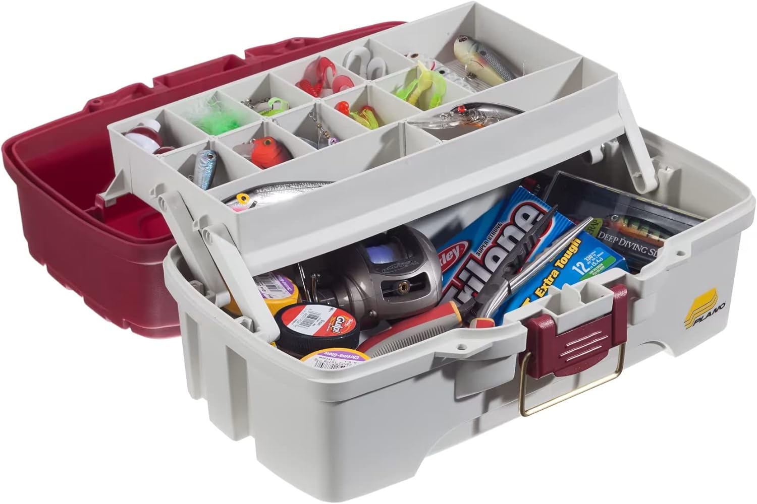 The Plano 1-Tray Tackle Box is the ultimate solution for all your fishing gear organization needs. This premium tackle storage box features a durable red metallic and off-white design that is both stylish and functional. With dual top access, you can easily access your tackle from either side of the box, making it convenient and efficient to find the right bait or lure.